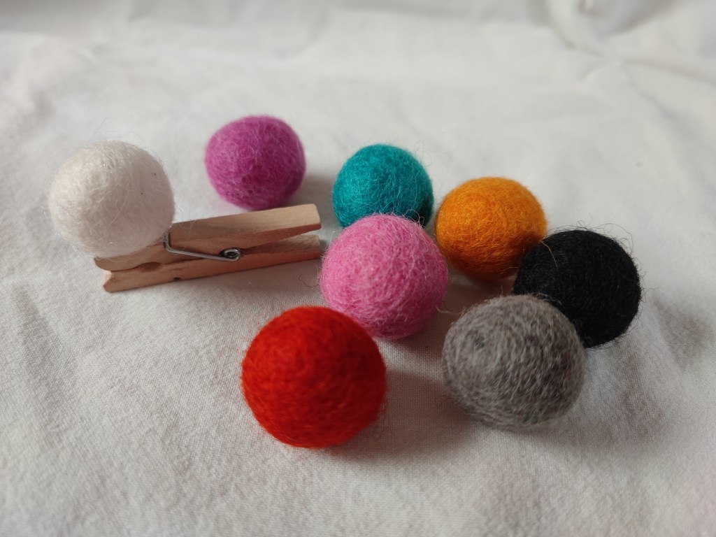 Pieni pyykkipoika, koko n. 4,5cm huopapallo koristeella 4€/kpl sis. 24% alv. Värit huopapalloille näet kuvasta, voit valita itse millä väreillä tehdään. Kuva voi hieman muuttaa värejä. Värit: valkoinen, musta, tumman harmaa, oranssi, poltettu oranssi, pinkki, fuksia (liilaan menevä) ja petrooli. Tarvittaessa voidaan tilata muunkin värisiä huopapalloja jos löytyy.